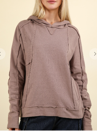 Mocha Raw Edge Cute Detail Hoodie Knit Top